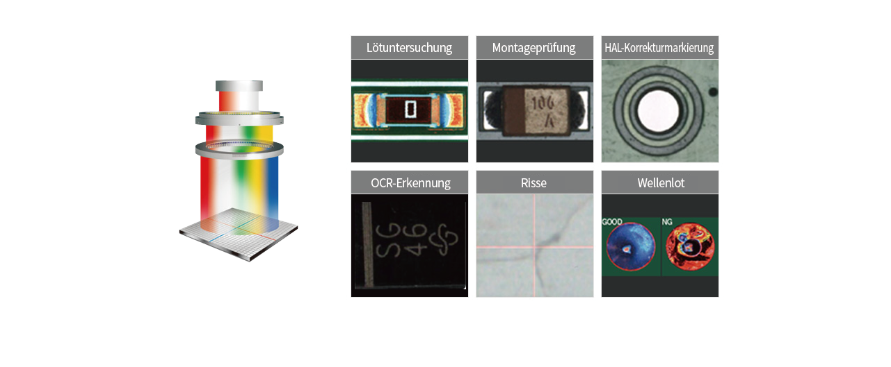 2D-Inspektionen verwenden verschiedene Informationen wie etwa Farbe und Schriftzeichen sowie Formen und Positionen und können verschiedene Inspektionsarten durchführen. Es gibt jedoch eine Einschränkung in Bezug auf die Erkennungsleistung von Defekten mit Bezug auf Höhe, da nur Ebenendaten verwendet werden.