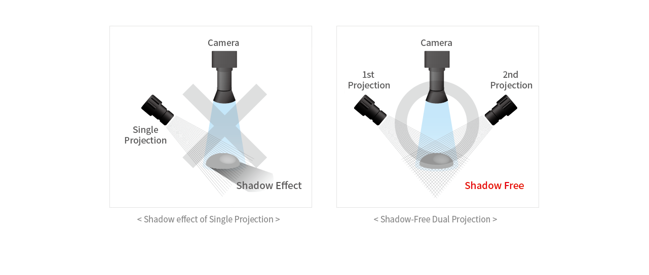 Shadow-free Dual Projection Moire Probeは高いはんだの3D測定時、影による歪曲の可能 |