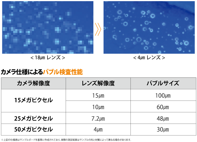 コンフォーマルコーティングで最も重要な検査項目であるバブル検査の精密性を確保するために、GENESYS-CCには最大50M 4μmの超高解像度光学系が適用されます。