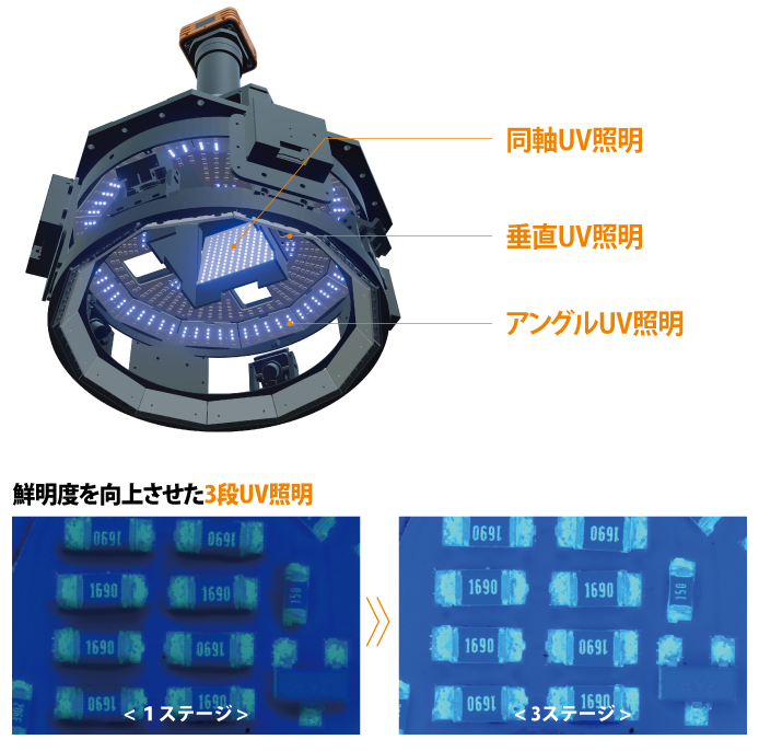 GENESYS-CCは、一般的なCCI装備とは異なり、低角、高角、同軸の3つの角度でUV照明が装備されています。