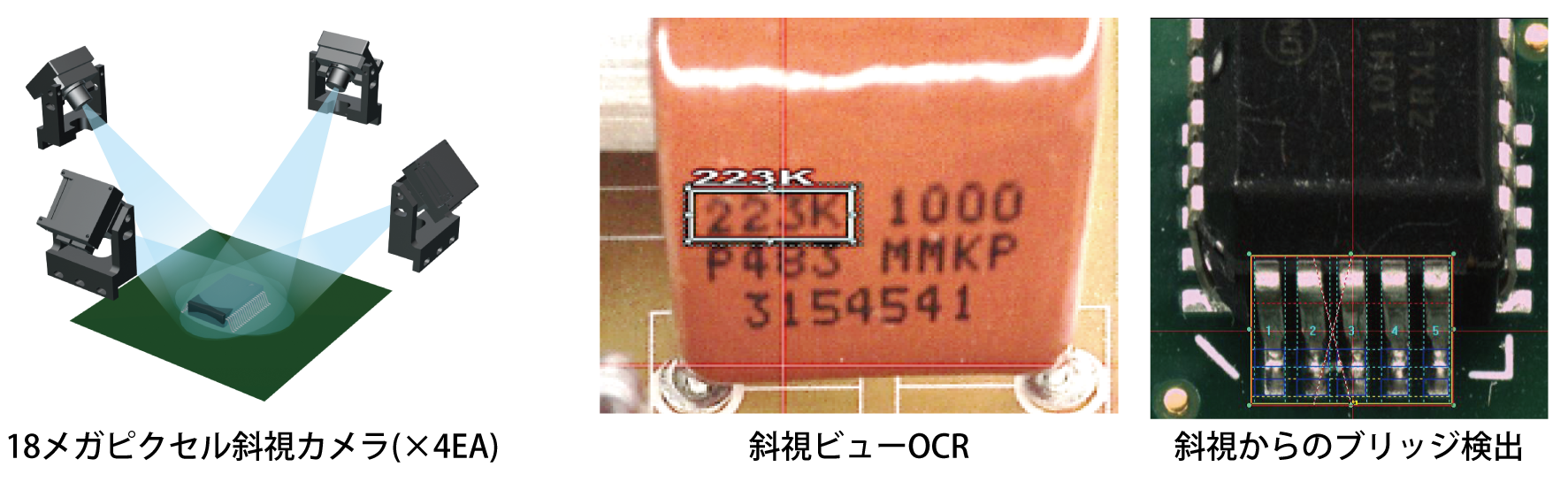 4つの高解像度サイドカメラで部品側面のOCR検査はもちろん、Jリード、コイル、QNFなど上段カメラで検査不可能な領域のはんだを検査することができます。