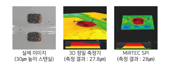 소프트웨어와 하드웨어의 꾸준한 개선을 통해 미르기술의 SPI는 0201㎜ 사이즈 부품의 패드, 스텐실 높이 30 솔더 페이스트 검사가 가능한 정밀도를 갖추었습니다.