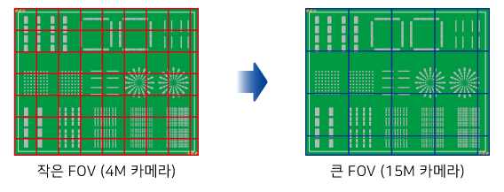 고해상도 카메라의 이점은 1회 촬상 시의 범위(FOV)가 넓다는 것입니다. 넓은 FOV는 전체 검사 영역에 대한 필요 촬상 횟수를 줄임으로써 검사 속도를 빠르게 합니다.