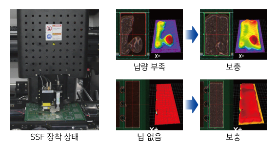 미르기술의 SSF (Solder Supplying Function)는 검사된 패드가 미납, 소납으로 판정되었을 때 광학계에 장착된 디스펜서를 통해 자동으로 해당 부분을 보충할 수 있습니다.